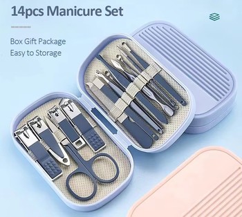 14-Piece Luxurious Stainless Steel 7 in 1 Nail Scissors Manicure Pedicure Set Pink Blue Clippers Ear Digging Spoon for Men Women